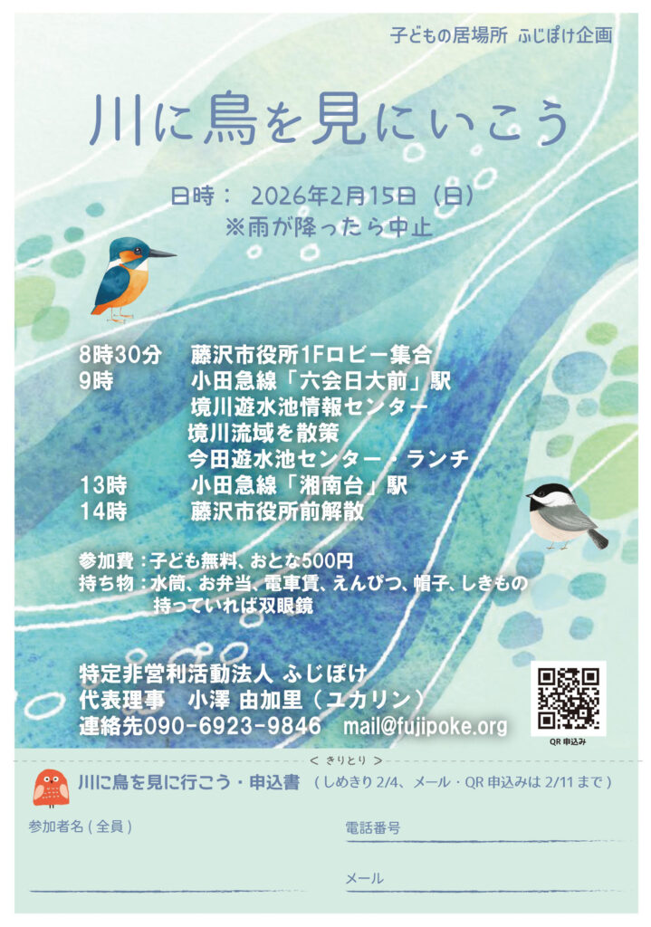 2/15(日) 野鳥観察 お知らせ 2026.01.31 境川流域の鳥たちを見に行きます。 今年で野鳥観察も4回目!どんな鳥に会えるかな。 2026年2月15日(日) 8:30 藤沢市市役所前集合 14:00 藤沢市市役所前解散予定です。 ◆◇– 要申込み(締切:2/11(水)) 参加費:大人500円、子ども無料 持ち物:お弁当、水筒、電車賃、えんぴつ、帽子、しきもの 持っていれば双眼鏡 ※歩きやすい靴